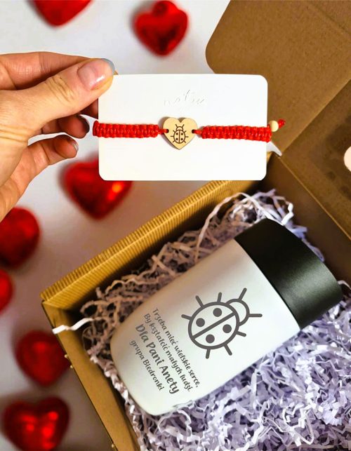 0opinii99,00złPrezent dla Przedszkolanki Cioci żłobkowej bransoletka i kubek termiczny z grawerem. Podaj kolor sznurka oraz numer wzoru do wygrawerowania na bransoletce i kubku.